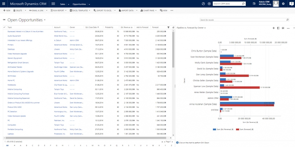 Конструктор звітів і діаграм, інструменти розширеного пошуку та управління уявленнями дозволяють аналізувати конверсію етапів продажів, а також прибутковість по клієнтським сегментам, географії, виконавцям, підрозділам, періодам, продуктам або кампаніям. При цьому функція drill down дозволяє динамічно «провалюватися» в діаграми, забезпечуючи деталізацію даних.